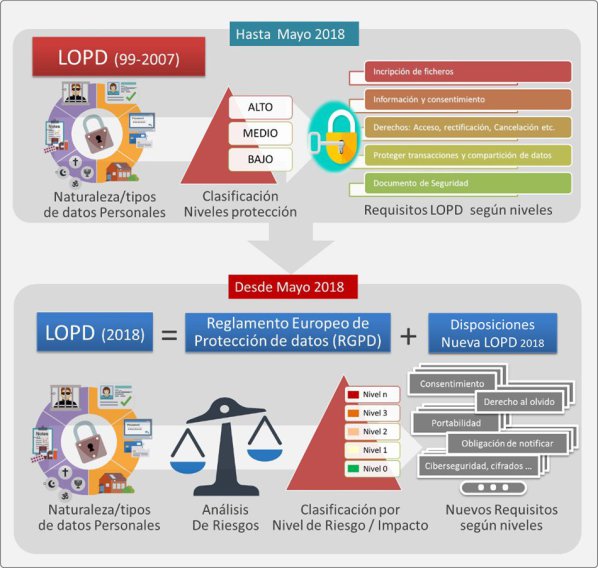El Reglamento general de protección de datos de la UE, Reglamento UE 2016/679, de 27 de abril de 2016 (en adelante RGPD) y la Ley 3/2018, Ley Orgánica de Protección de Datos y Garantía de Derechos Digitales (en adelante LOPDGDD), obligan a todas las entidades a revisar sus actuaciones y medidas de seguridad en materia de protección de datos, suponiendo un cambio radical con respecto a la normativa anterior (Ley 15/1999 y reglamento RD 1720/2007) pues exige una actitud consciente, diligente y proactiva por parte de las organizaciones frente a todos los tratamientos de datos personales que lleven a cabo, por lo que la entidad responsable debe estar en condiciones de demostrar que ha implantado unas adecuadas medidas. Además se introducen importantes novedades, estrictas obligaciones para los encargados del tratamiento de datos personales, nuevos derechos y sanciones de hasta 20 millones de euros o incluso del 4 % de la facturación anual mundial de la empresa u organización.